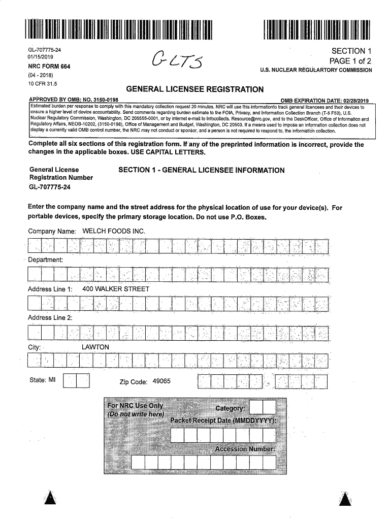 WITHIN BIKINI II Lowell Lille Lille Lille lull 1111111111111111111IIIIIII II 1111111111111111111111111111111GL70777524 01/15/2019SECTION 1 PAGE 1 of 2NRC FORM 664U. S. NUCLEAR REGULAR.TORY COMMISSION(04