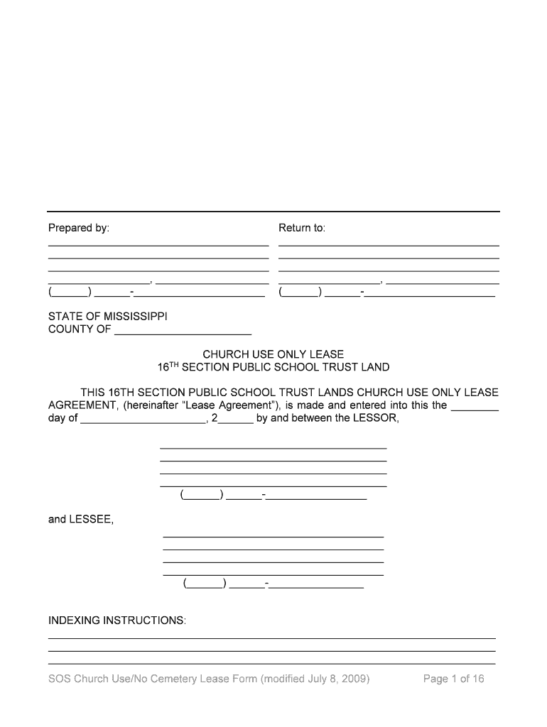 Prepared by:, () Return to:, () STATE OF MISSISSIPPI COUNTY OF CHURCH USE ONLY LEASE 16TH SECTION PUBLIC SCHOOL TRUST LAND THIS 16TH SECTION PUBLIC SCHOOL TRUST LANDS CHURCH USE ONLY LEASE AGREEMENT,