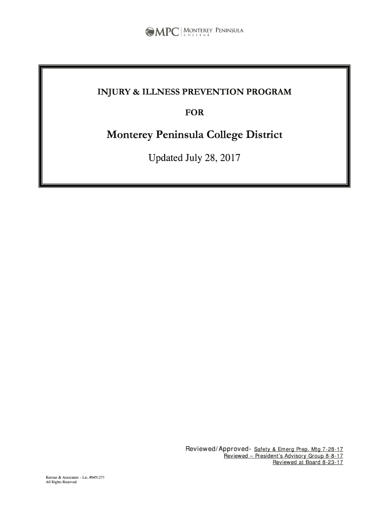 INJURY & ILLNESS PREVENTION PROGRAM FOR Monterey Peninsula College District Updated July 28, 2017Reviewed/Approved Safety & Emerge Prep. Mtg 72817 Reviewed Presidents Advisory Group 8817 Reviewed