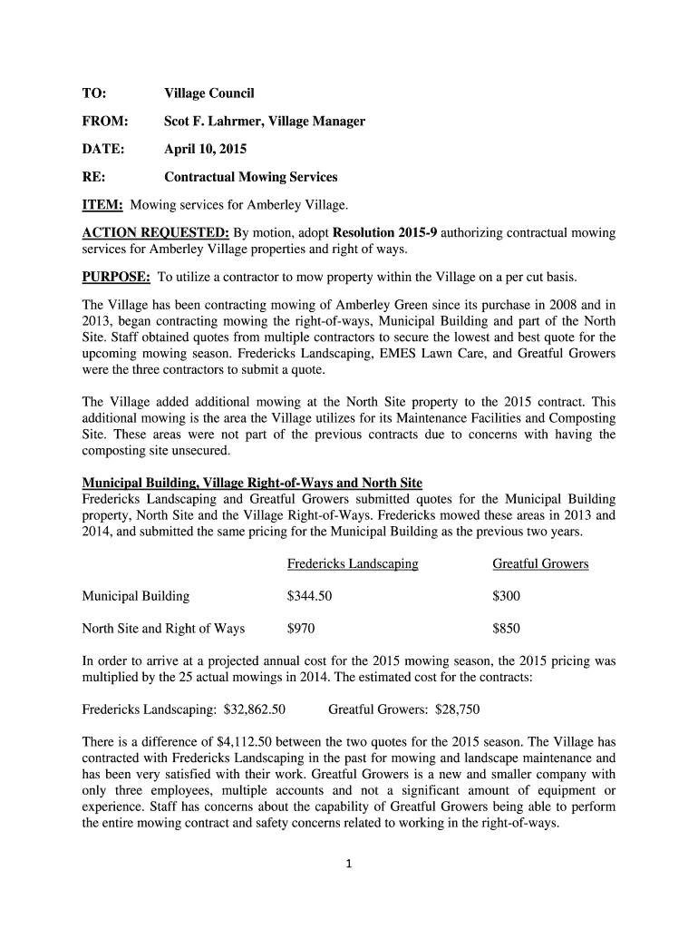 TO:Village Councilor:Scot F. Larger, Village Managerial:April 10, 2015RE:Contractual Mowing ServicesITEM: Mowing services for Alberta Village.