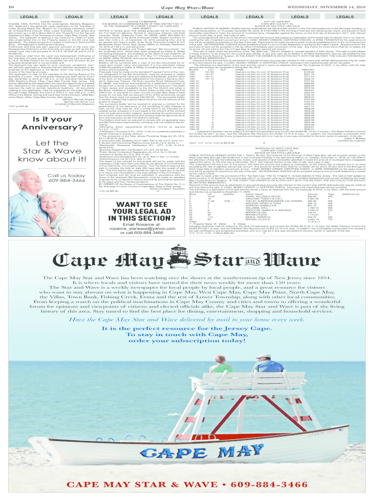 B6WEDNESDAY, NOVEMBER 14, 2018, LEGALSLEGALSLEGAL NOTICE PLEASE TAKE NOTICE that the undersigned, Marcello McGovern (the Applicant) has generally made application to the Township of Lower Zoning Board