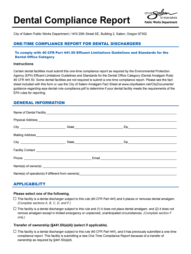 Dental Compliance Report City of Salem Public Works Department 1410 20th Street SE, Building 2, Salem, Oregon 97302ONETIME COMPLIANCE REPORT FOR DENTAL DISCHARGERS To comply with 40 CFR Part 441.50