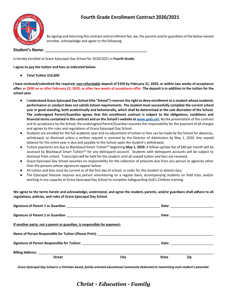Fourth Grade Enrollment Contract 2020/2021By signing and returning this contract and enrollment fee, we, the parents and/or guardians of the below named