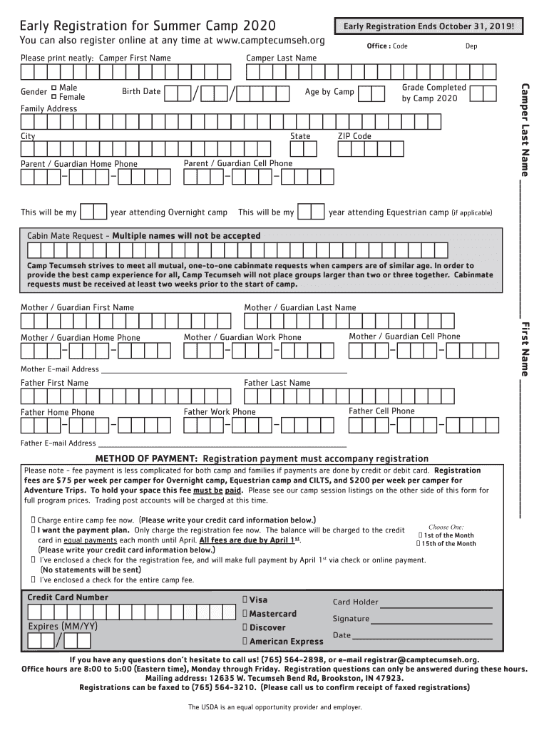 Early Registration for Summer Camp 2020Early Registration Ends October 31, 2019! You can also register online at any time at www.camptecumseh.org Please print neatly: Camper First Name Birth Damage