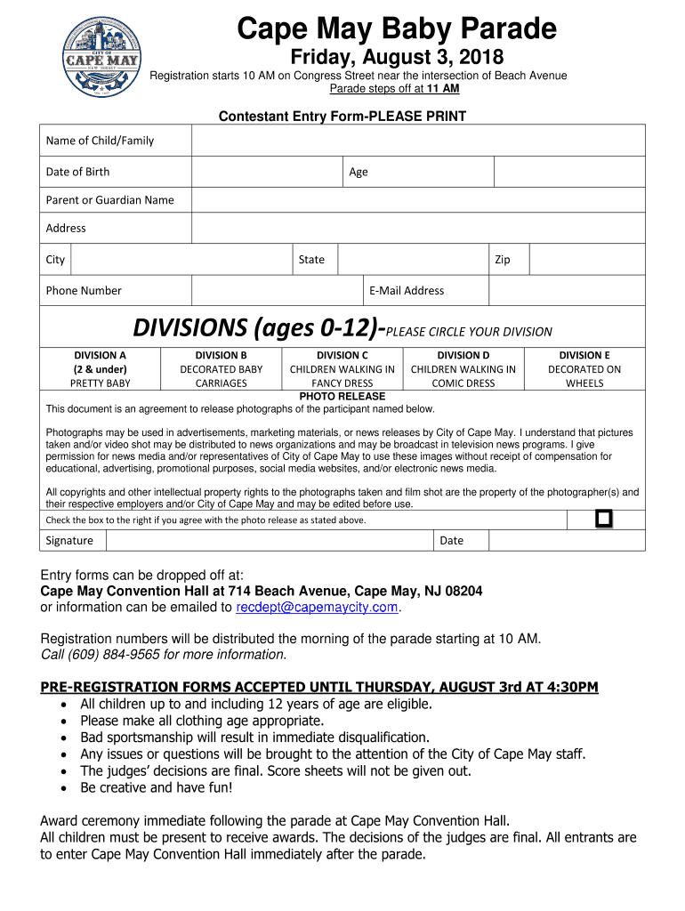 Cape May Baby Parade Friday, August 3, 2018, Registration starts 10 AM on Congress Street near the intersection of Beach Avenue Parade steps off at 11 Contestant Entry Formulas PRINT Name of Child/Family