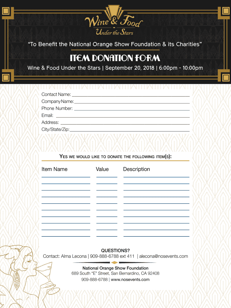 To Benet the National Orange Show Foundation & its Charities item d0nati0n f0rm Wine & Food Under the Stars September 20, 2018 6:00pm 10:00pmContact Name: Company Name: Phone Number: Email: Address: