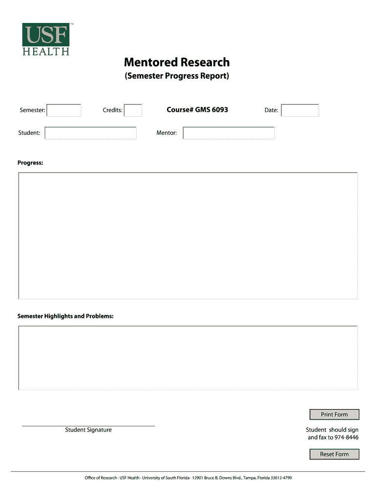 Mentored Research (Semester Progress Report) Semester: Credits: Student: Course# GMS 6093 Date: Mentor: Progress: Semester Highlights and Problems: Print Form Student Signature Student should sign