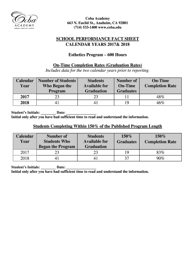 Cuba Academy 663 N. Euclid St., Anaheim, CA 92801 (714) 5331400 www.coba.eduSCHOOL PERFORMANCE FACT SHEET CALENDAR YEARS 2017& 2018 Aesthetics Program 600 Hours Onetime Completion Rates (Graduation