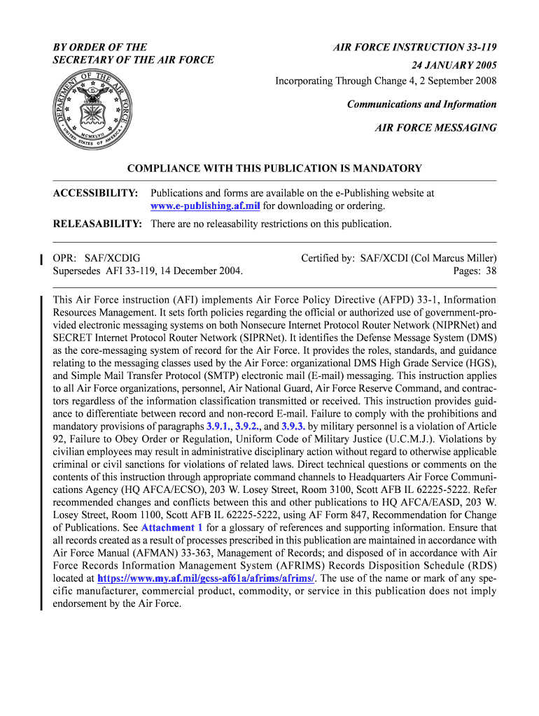 BY ORDER OF THE SECRETARY OF THE AIR FORCE INSTRUCTION 33-119 24 JANUARY 2005 Incorporating Through Change 4, 2 September 2008 Communications and Information AIR FORCE MESSAGING COMPLIANCE WITH THIS