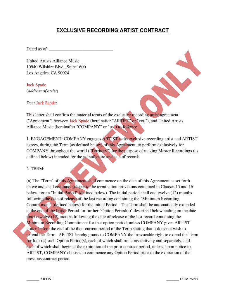 EXCLUSIVE RECORDING ARTIST Contracted as of: United Artists Alliance Music 10940 Wilshire Blvd., Suite 1600 Los Angeles, CA 90024 Jack Spade (address of artist) Dear Jack Spade: This letter shall