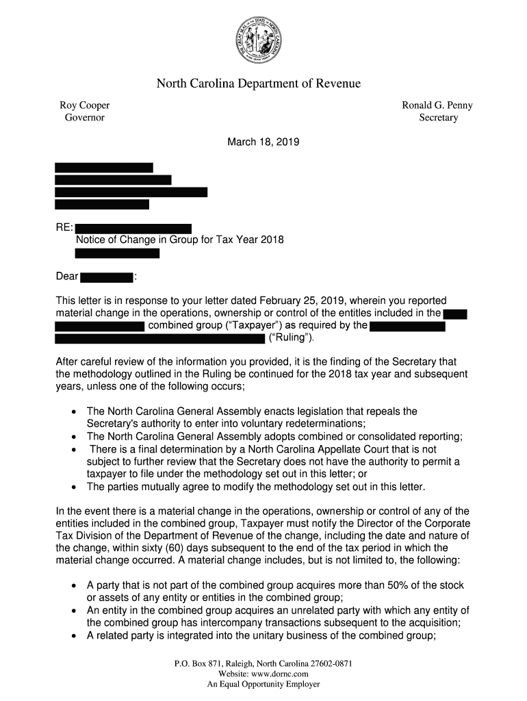 Notice of Change in Group for Tax Year 2018Dear:This letter is in response to your letter dated
