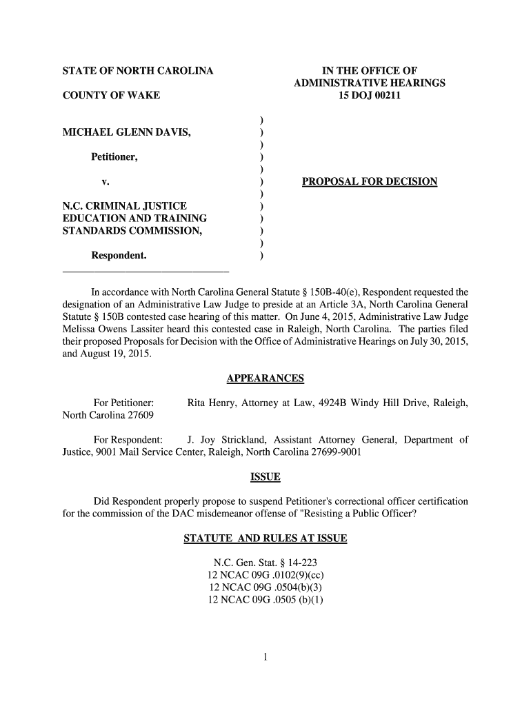 STATE OF NORTH CAROLINA THE OFFICE OF ADMINISTRATIVE HEARINGS 15 DOJ 00211COUNTY OF CARMICHAEL GLENN DAVIS, Petitioner, v. N.C. CRIMINAL JUSTICE EDUCATION AND TRAINING STANDARDS COMMISSION, Respondent.