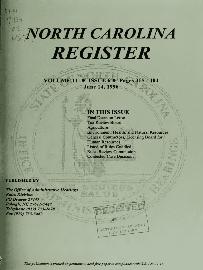% NORTH CAROLINA REGISTER VOLUME 11 ISSUE 6 Pages 315 404 June 14, 1996IN THIS ISSUE Final Decision Letterman Review Board AgricultureEnvironment, Health, and Natural Resources General Contractors,