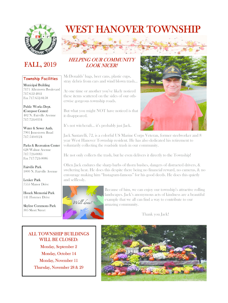 WEST HANOVER TOWNSHIPFALL, 2019HELPING OUR COMMUNITY LOOK NICER! Township FacilitiesMcDonalds bags, beer cans, plastic cups, stray debris from cars and wind blown trashMunicipal Building 7171 Allentown