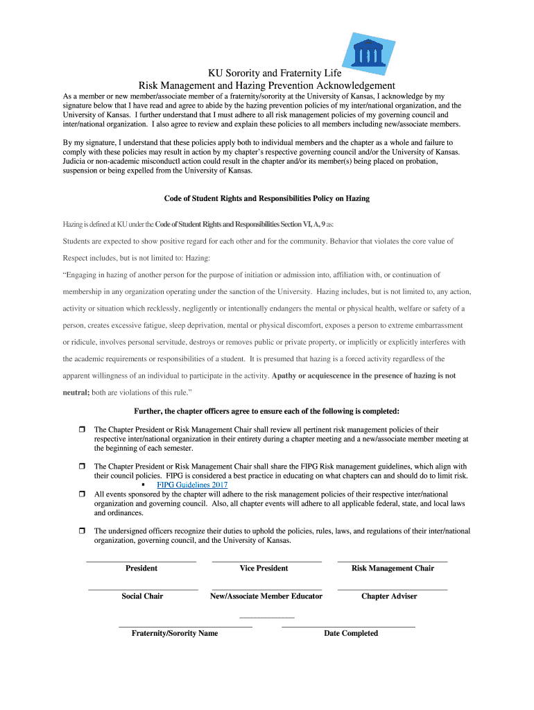 As a member or new member/associate member of a fraternity/sorority at the University of Kansas, I acknowledge