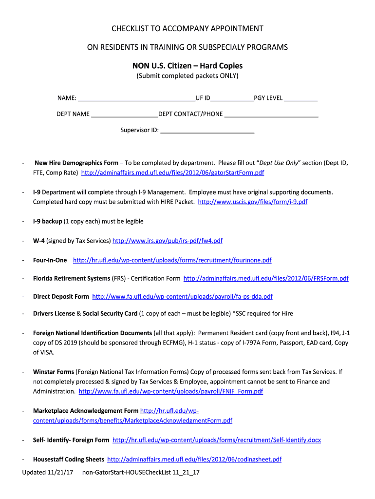 CHECKLIST TO ACCOMPANY APPOINTMENT ON RESIDENTS IN TRAINING OR SUBSPECIALTY PROGRAMS NON U.S. Citizen Hard Copies (Submit completed packets ONLY)NAME: OF ID PAY LEVEL DEPT NAME DEPT CONTACT/PHONE