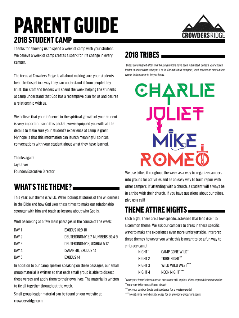 PARENT GUIDE2018 STUDENT Camphenes for allowing us to spend a week of camp with your student.
