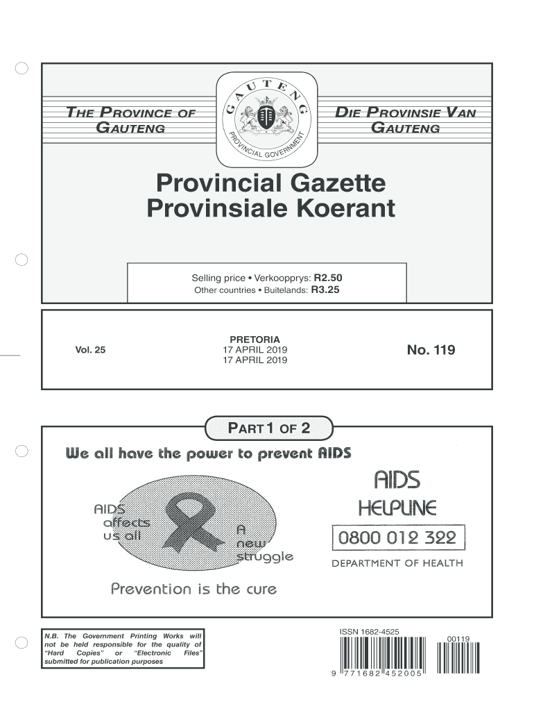 The Province Gautengof UNITYINDIVERSITYDie Province Van GautengProvincial Gazette Provincial Korean Selling price Verkoopprys: R2.50 Other countries Woodlands:R3.25PRETORIA 17 APRIL 2019 17 APRIL