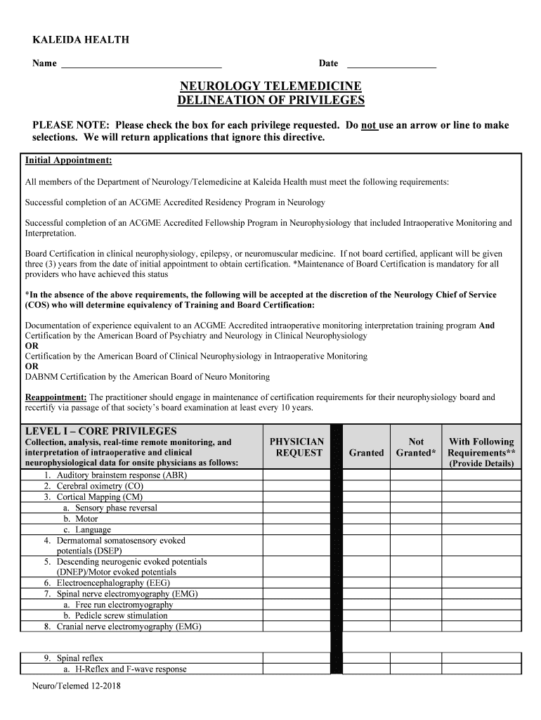 Get the free neurology telemedicine delineation of privileges - Kaleida ...