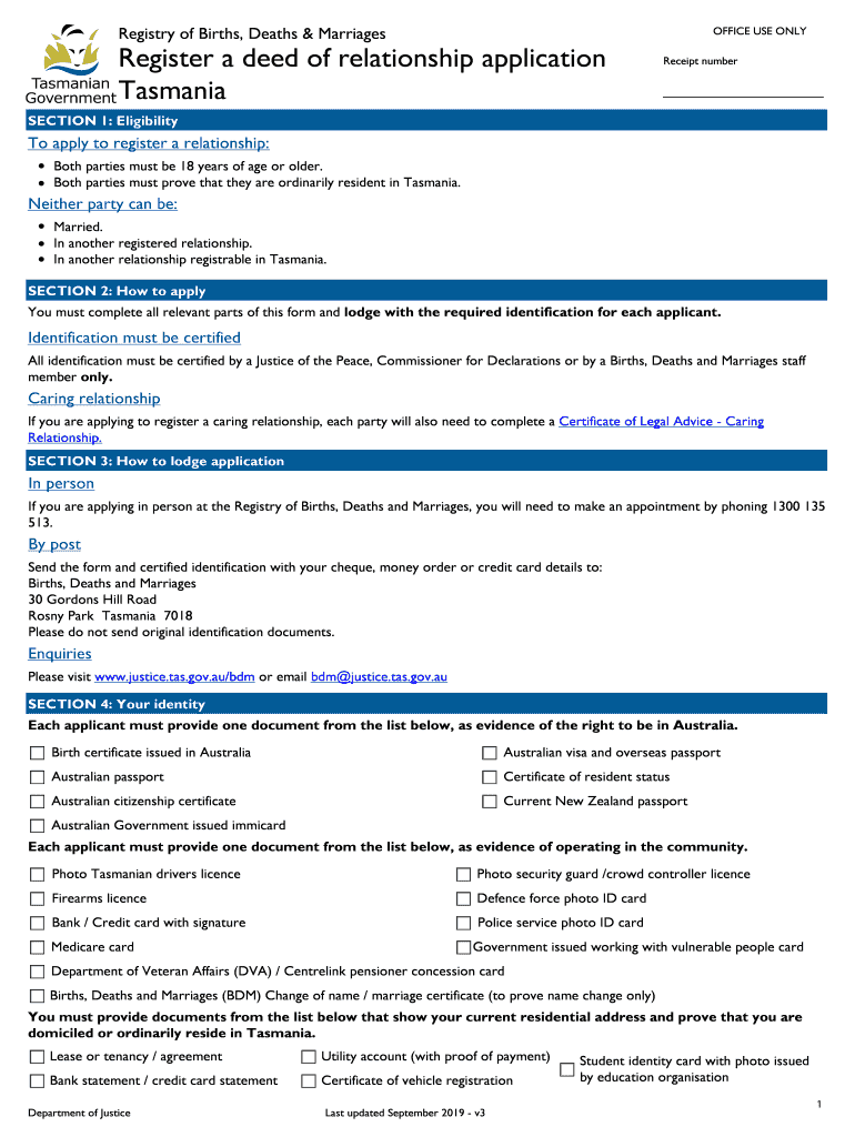 Registry of Births, Deaths & MarriagesOFFICE USE Unregister a deed of relationship application TasmaniaReceipt numberSECTION 1: Eligibility apply to register a relationship: Both parties must be 18