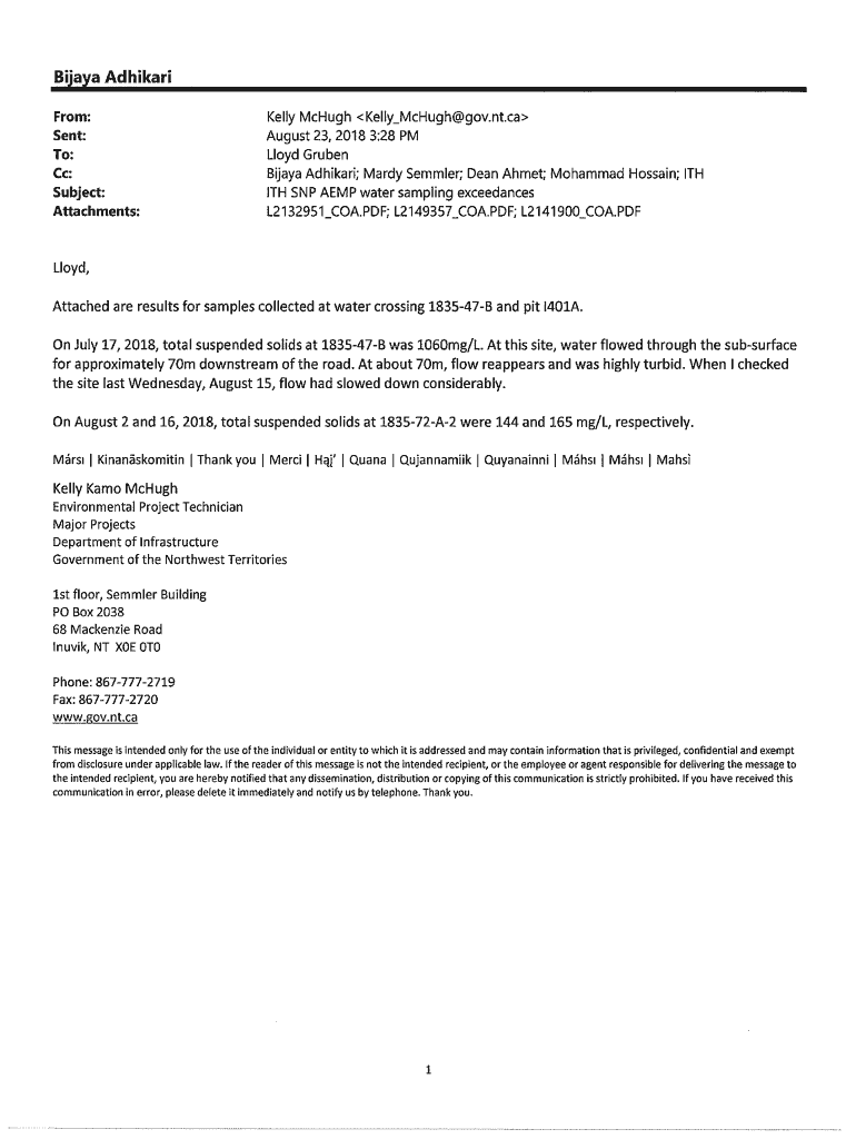 GOVERNMENT OF NWT ATTN: Kelly Kama McHugh PO Box 1320 YELLOWKNIFE NT X1A 2L9Date Received: 19JUL18 Report Date: 27JUL18 17:53 (MT) Version: FINALClient Phone: 8677772719Certificate of Analysis Lab
