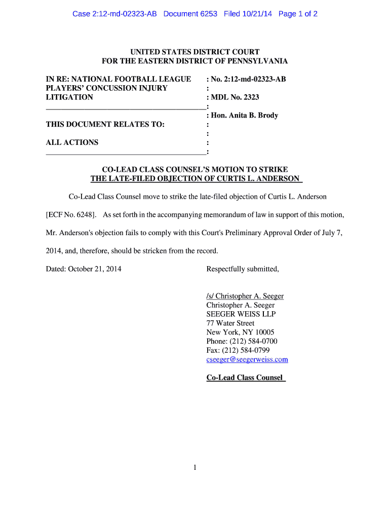 Case 2:12md02323AB Document 6253 Filed 10/21/14-Page 1 of 2UNITED STATES DISTRICT COURT FOR THE EASTERN DISTRICT OF PENNSYLVANIA IN RE: NATIONAL FOOTBALL LEAGUE : No. 2:12md02323AB PLAYERS CONCUSSION