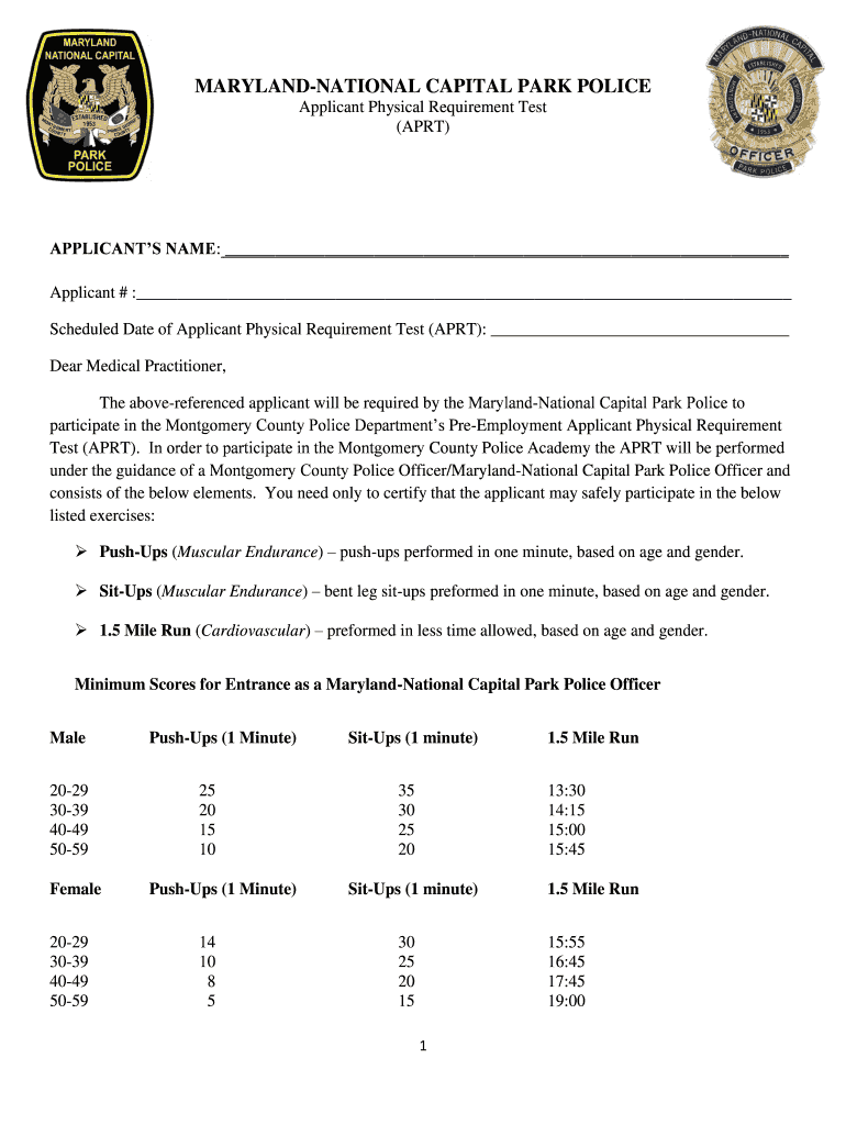MARYLANDNATIONAL CAPITAL PARK POLICE Applicant Physical Requirement Test (ART)APPLICANTS NAME: Applicant # : Scheduled Date of Applicant Physical Requirement Test (ART): Dear Medical Practitioner,
