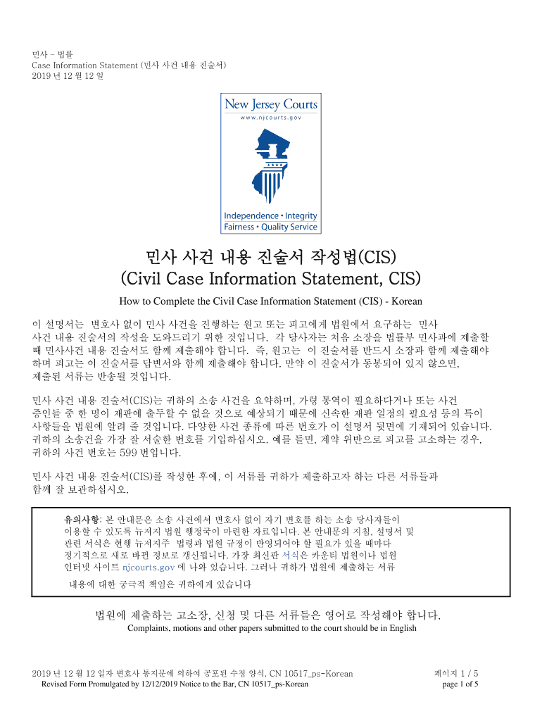 Case Information Statement () 2019 12 12 (CIS) (Civil Case Information Statement, CIS) How to Complete the Civil Case Information Statement (CIS) Korean.