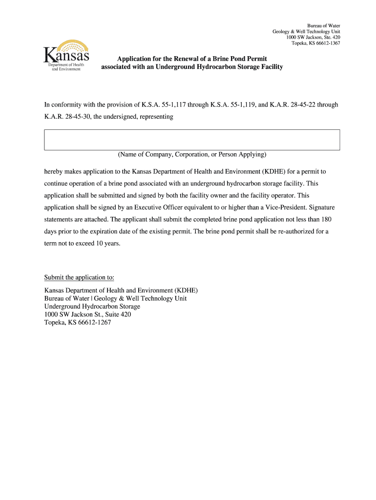 Bureau of Water Geology & Well Technology Unit 1000 SW Jackson, Ste. 420 Topeka, KS 666121367Application for the Renewal of a Brine Pond Permit associated with an Underground Hydrocarbon Storage Facility