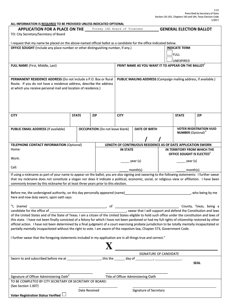 221 Prescribed by Secretary of State Section 141.031, Chapters 143 and 144, Texas Election Code 1/2017ALL INFORMATION IS REQUIRED TO BE PROVIDED UNLESS INDICATED OPTIONAL Lorna ISD Board of Trustees