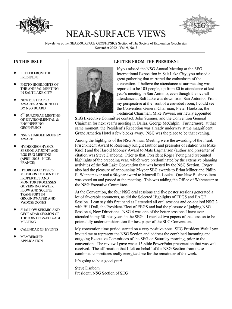 RESURFACE VIEWS Newsletter of the RESURFACE GEOPHYSICS Section of The Society of Exploration Geophysics November 2002, Vol. 9, No. 3IN THIS ISSUE LETTER FROM THE PRESIDENT PHOTO HIGHLIGHTS OF THE