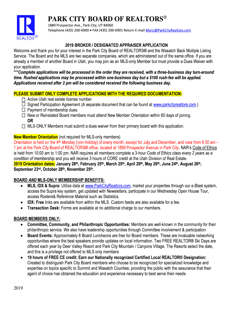 PARK CITY BOARD OF REALTORS 1889 Prospector Ave., Park City, UT 84060 Telephone (435) 2006900 FAX (435) 2006901 Return Email Marci ParkCityRealtors.com2019 BROKER / DESIGNATED APPRAISER APPLICATION