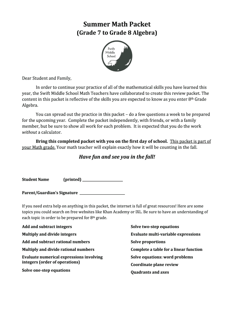 Summer Math Packet (Grade 7 to Grade 8 Algebra)Dear Student and Family, In order to continue your practice of all the mathematical skills you have learned this year, the Swift Middle School Math Teachers