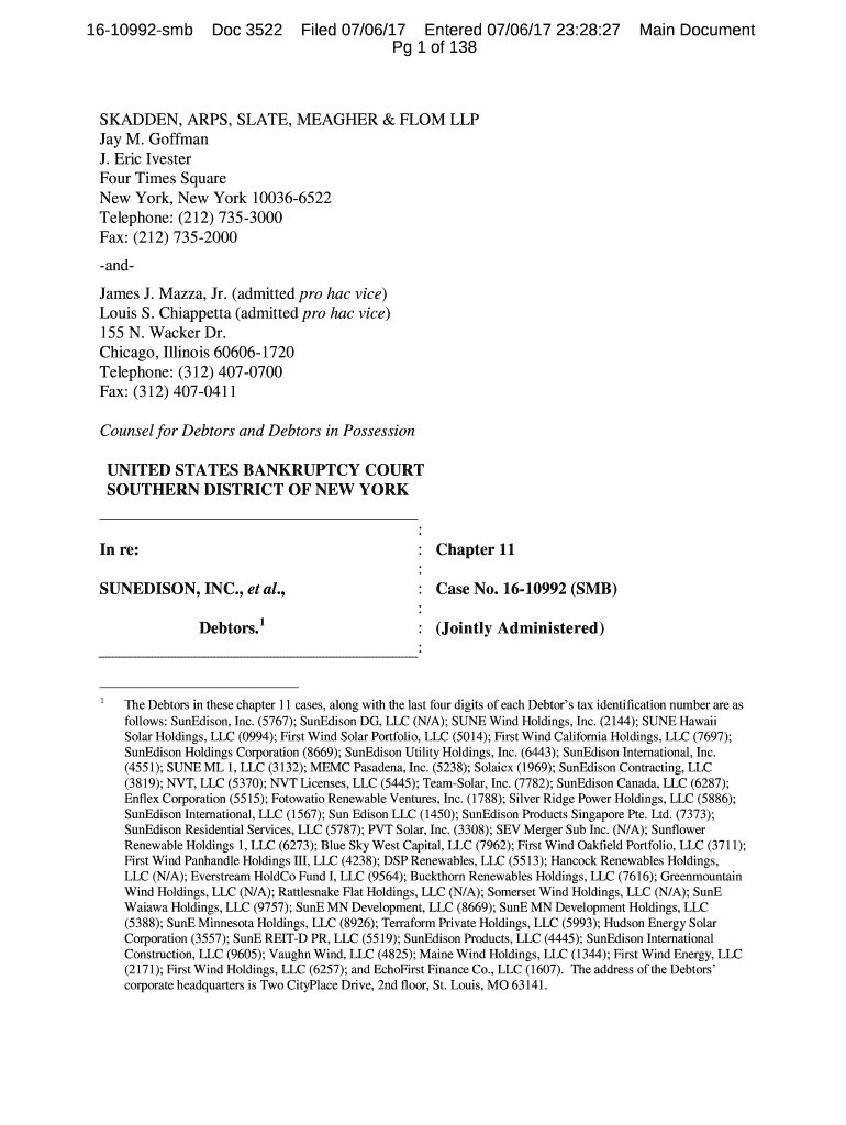 1610992smbDoc 3522Filed 07/06/17 Entered 07/06/17 23:28:27 Pg 1 of 138Main DocumentSKADDEN, ARMS, SLATE, MEAGER & FROM LLP Jay M. Goffman J. Eric Iv ester Four Times Square New York, New York 100366522