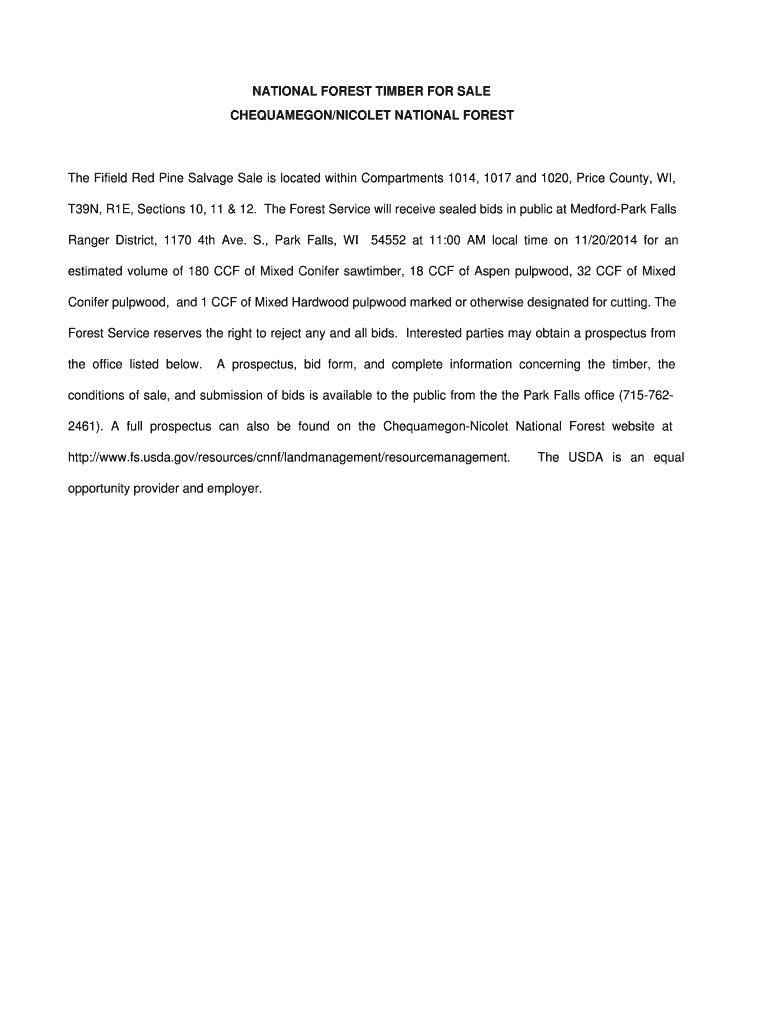 NATIONAL FOREST TIMBER FOR SALE CHEQUAMEGON/NICOLE NATIONAL Forsythe Field Red Pine Salvage Sale is located within Compartments 1014, 1017 and 1020, Price County, WI, T39N, R1E, Sections 10, 11 &