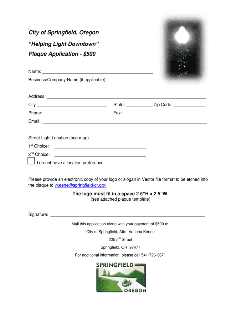 City of Springfield, Oregon Helping Light Downtown Plaque Application $500 Name: Business/Company Name (if applicable): Address: City State: Zip Code: Phone: Fax: Email: Streetlight Location (see