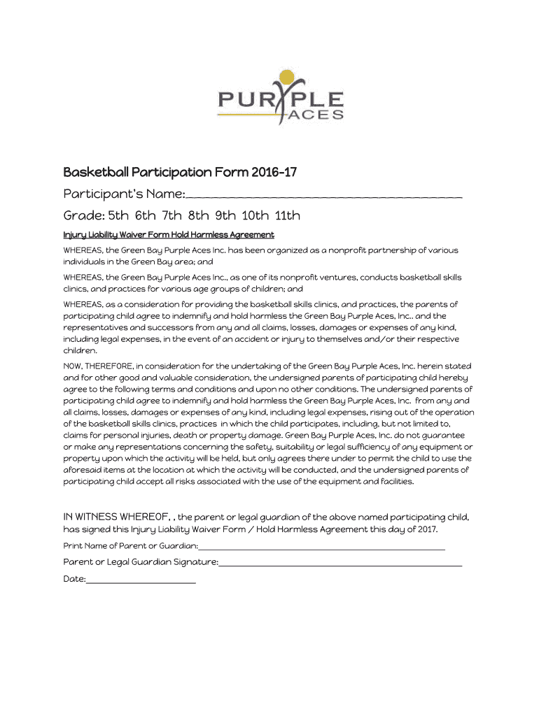 Basketball Participation Form 201617 Participant's Name: Grade: 5th 6th 7th 8th 9th 10th 11th Injury Liability Waiver Form Hold Harmless Agreement WHEREAS, the Green Bay Purple Aces Inc. has been
