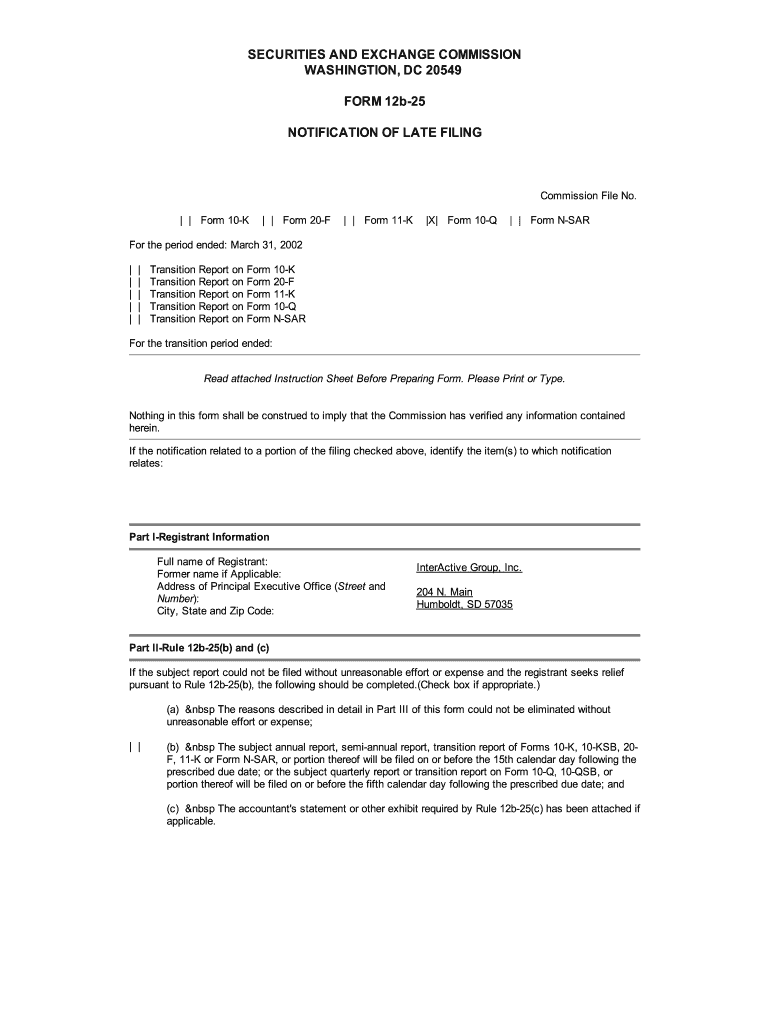 SECURITIES AND EXCHANGE COMMISSION WASHINGTON, DC 20549 FORM 12b25 NOTIFICATION OF LATE FILINGCommission File No. Form 10K Form 20F Form 11K X Form 10Q Form Narrow the period ended: March 31, 2002,