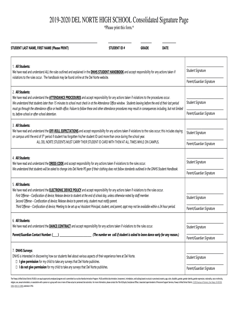 20192020 DEL NORTE HIGH SCHOOL Consolidated Signature Page *Please print this form.* STUDENT LAST NAME, FIRST NAME (Please PRINT)STUDENT ID #GRADEDATE1. All Students: We have read and understand ALL