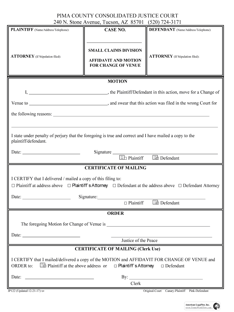 Get the free JP122 - Small Claims Motion Change Venue & Order.pdf