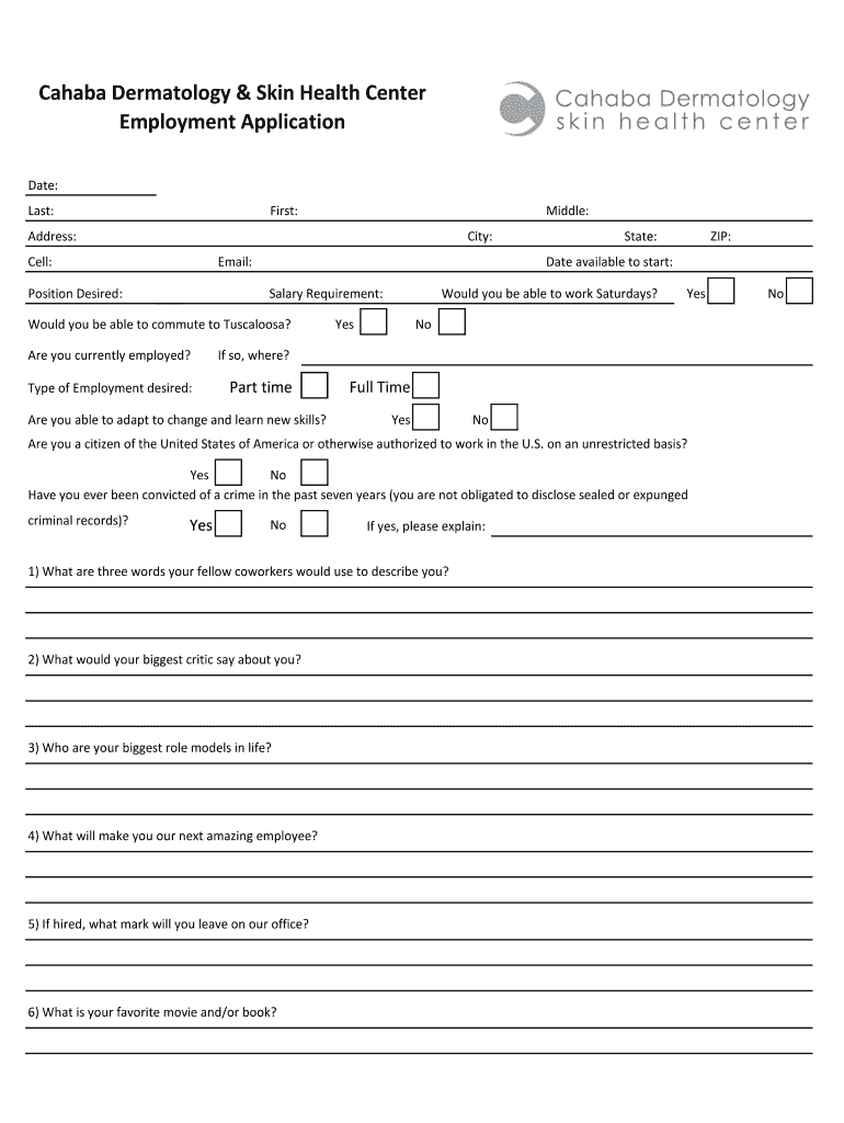 Casaba Dermatology & Skin Health Center Employment Application Date: Last:First:Middle:Address:City:Cell:ZIP:Date available to start:Email:Position Desired:State:Would you be able to work Saturdays?