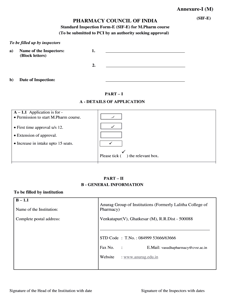Annexed (M) PHARMACY COUNCIL OF INDIA(SIFE)Standard Inspection Form (SIFE) for M. Harm course (To be submitted to PCI by an authority seeking approval) To be filled up by inspectors a)b)Name of the