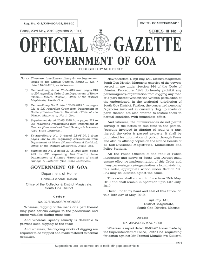 RNA No. GOING/2002/6410Reg. No. G2/RNA/GOA/32/201820SERIES III No. 8Panaji, 23rd May 2019 (Aisha 2, 1941)PUBLISHED BY AUTHORITY Note: There are three Extraordinary & two Supplement issues to the Official