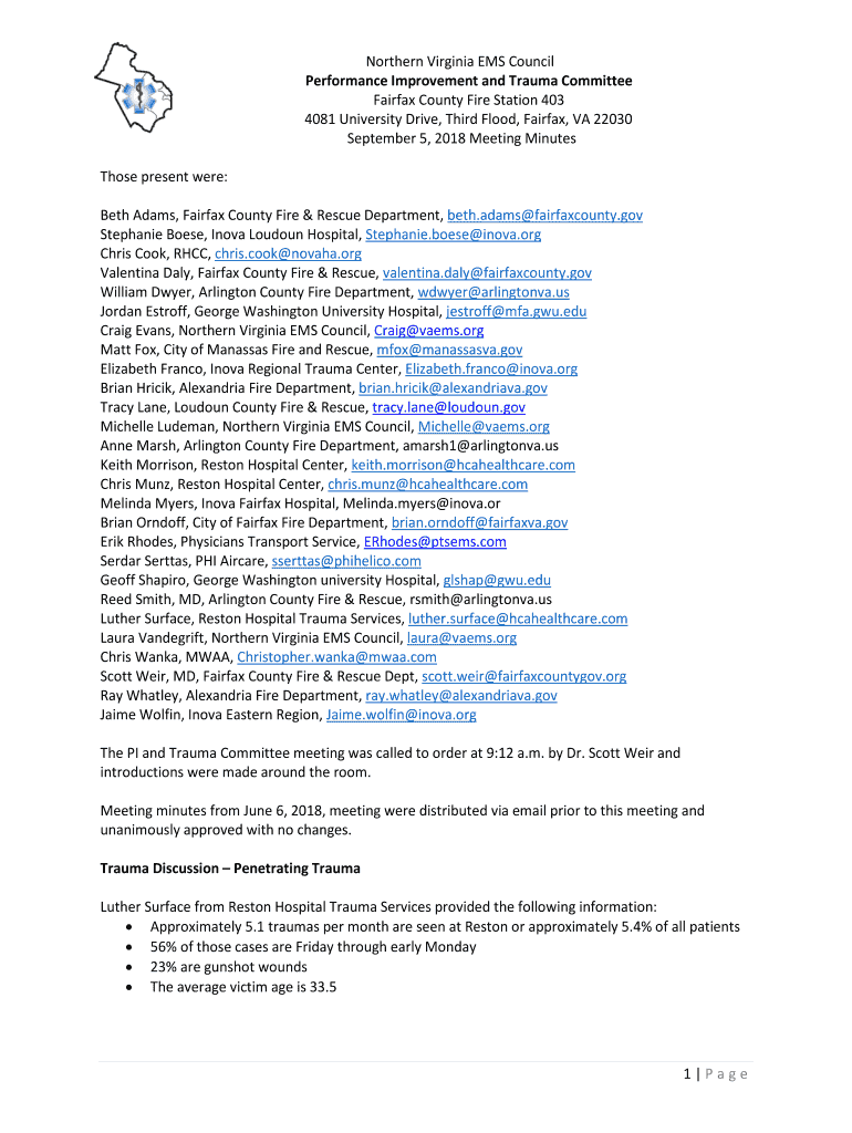 Northern Virginia EMS Council Performance Improvement and Trauma Committee Fairfax County Fire Station 403 4081 University Drive, Third Flood, Fairfax, VA 22030 September 5, 2018, Meeting Minutes
