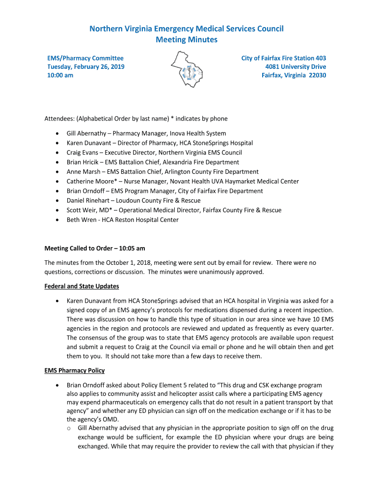 Northern Virginia Emergency Medical Services Council Meeting Minutes EMS/Pharmacy Committee Tuesday, February 26, 2019 10:00 amity of Fairfax Fire Station 403 4081 University Drive Fairfax, Virginia