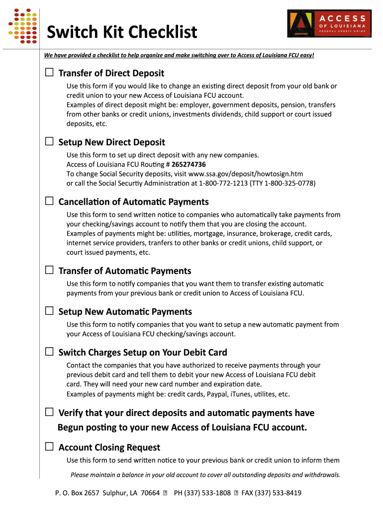 The Switch Kit Checklist is a vital tool for account holders at Access of Louisiana FCU, designed to streamline the transition to a new bank account. This checklist provides a structured approach for individuals switching from another bank, ensuring that all necessary steps are covered. With the checklist, users can manage their direct deposit transfers and automatic payment changes efficiently, reducing the hassle typically associated with switching banking institutions.