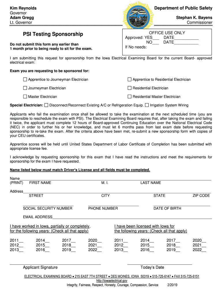 Department of Public Safety Kim Reynolds Governor Adam Gregg Lt. Governor Stephan K. Bayes Commissioners Testing Sponsorship Do not submit this form any earlier than 1 month prior to being ready to