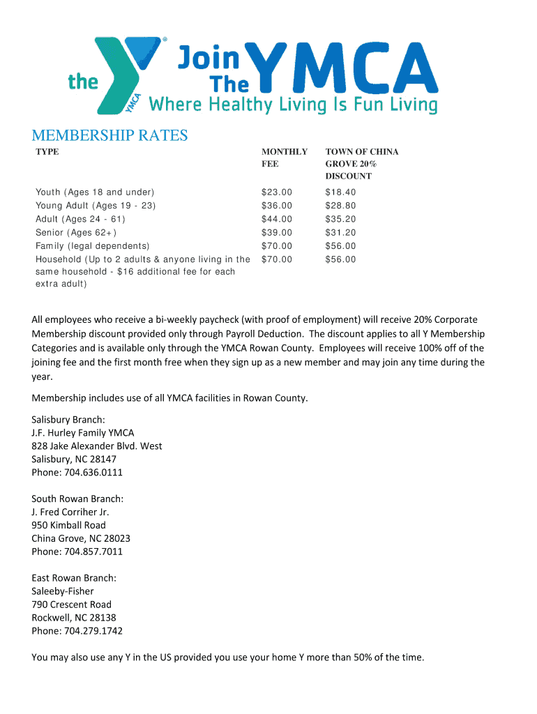 MEMBERSHIP RATES TRIMONTHLY FREETOWN OF CHINA GROVE 20% DISCOUNTYouth (Ages 18 and under) Young Adult (Ages 19 23)$$$$23.0036.0018.4028.80Adult (Ages 24 61) Senior (Ages 62+) Family (legal dependents)