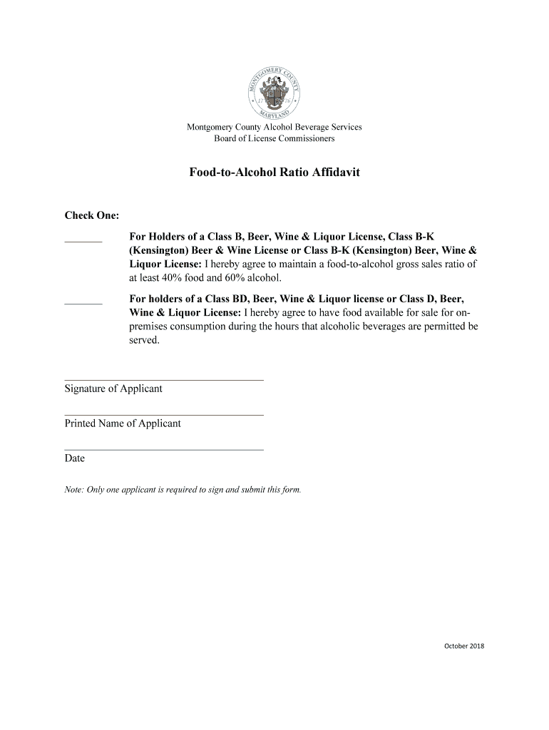 Montgomery County Alcohol Beverage Services Board of License CommissionersFoodtoAlcohol Ratio Affidavit Check One: For Holders of a Class B, Beer, Wine & Liquor License, Class BK (Kensington) Beer