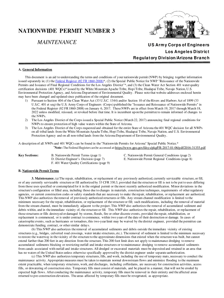 NATIONWIDE PERMIT NUMBER 3 MAINTENANCE US Army Corps of Engineers Los Angeles District Regulatory Division/Arizona Branch. General Information This document is an aid to understanding the terms and